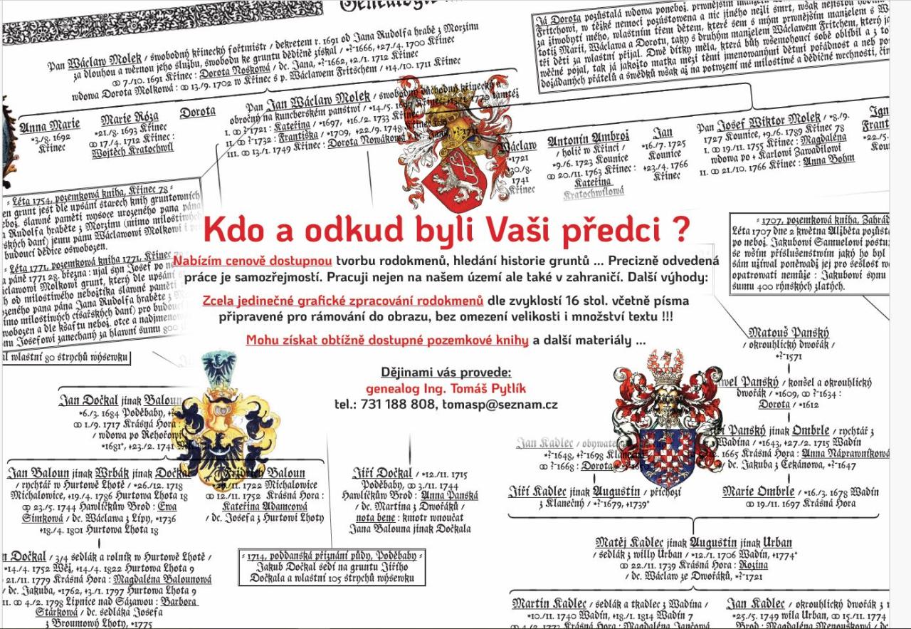 Genealog Ing. Tomáš Pytlík nabízí tvorbu rodokmenů. Telefon 731 188 808.