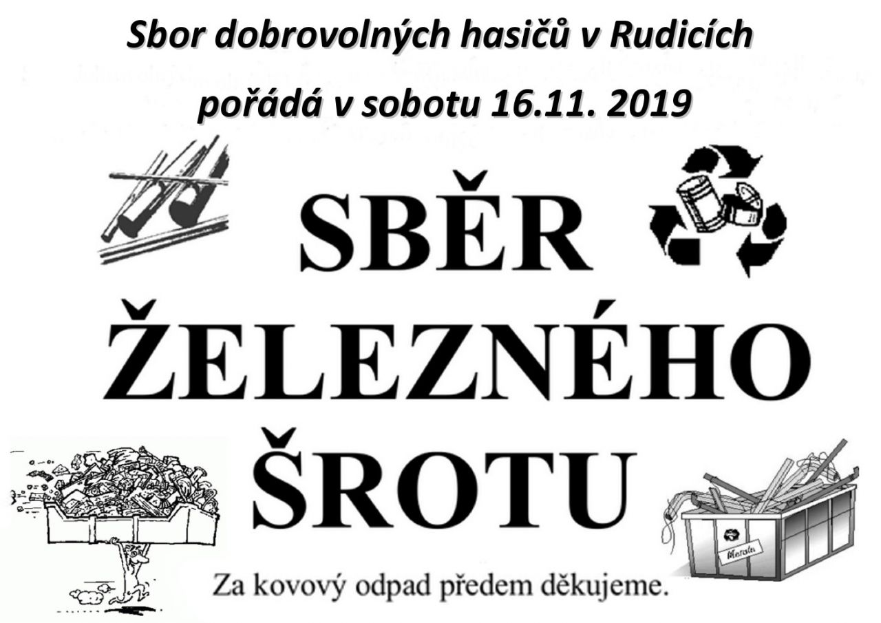 V dopoledních hodinách od /8.00/ provádí SDH Rudice sběr železného šrotu. Bližší informace u místostarosty obce p. Miroslava Pláška, telefon - kontakty.