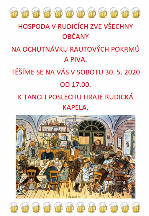 Sobotní odpoledne u hospody s Rudickou kapelou. V případě nepříznivého počasí v sále hospody, vstup s rouškou.