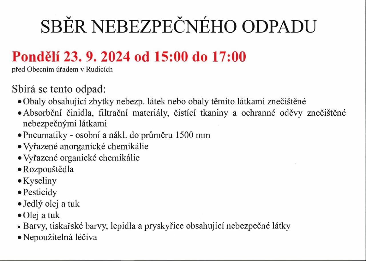 Přivezte před OÚ v den a čas svozu - 23. 9. 2024 od 15.00 do 17.00.