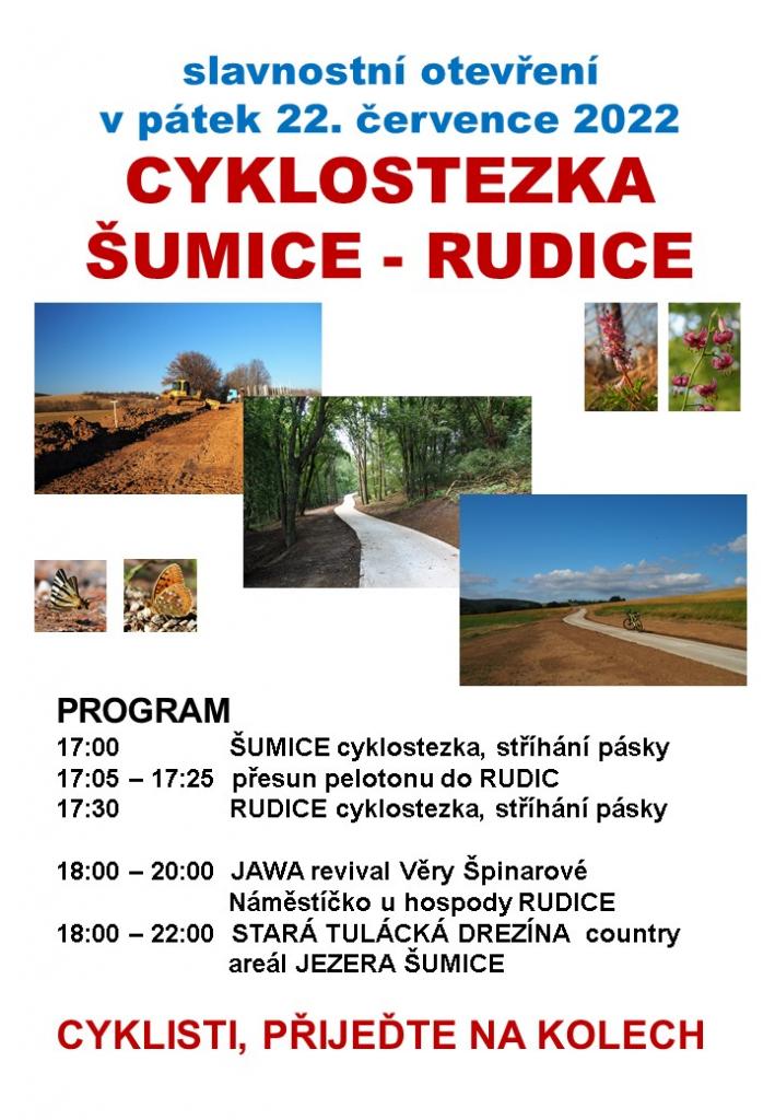 V pátek 22. 7. se koná slavnostní otvírání cyklostezky Šumice- Rudice. Začátek na šumické straně v 17.00, na rudické kolem 17.30. Poté přesun na Náměstíčko, kde od 18.00 hraje skupina JAWA hity Věry Špinarové. Občerstvení zajištěno. Za deštivého počasí hraje kapela v sále Hospody v Rudicích.