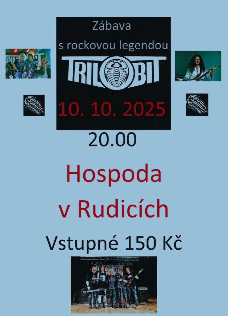 Zábava s oblíbenou kapelou Trilobit v Hospodě v Rudicích 10. 10. 2025 od 20.00, vstupné 150 Kč.