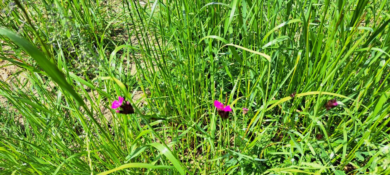 Kosení trávy tedy přijde na řadu nejdříve v červnu. Kromě podražce se objevila v menší míře stračka východní, jetel inkarnát, štírovník růžkatý, hvozdík kartouzek, pryskyřník prudký, úročník holboj, vikev ptačí a jetel plazivý. Určitě všem udělá radost pohled na vlčí mák a kopretinu, rostliny, které úporným sekáním trávy a vytvářením zelených prostor bez života už takřka z našich zahrad a luk vymizely.